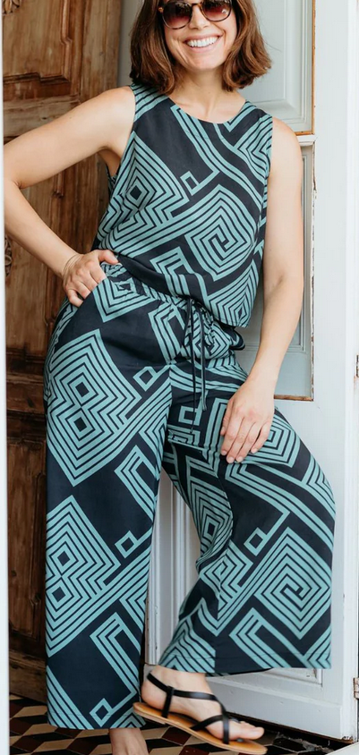 | Περιγραφή | Μπείτε στο καλοκαίρι με το παντελόνι Ameera Cropped Wide-Leg, τον τέλειο συνδυασμό άνεσης και ζωντανού στυλ. Κομμένο σε κοντό μήκος που φτάνει ακριβώς πάνω από τον αστράγαλο, διαθέτει χαλαρό φαρδύ σχήμα στο μπατζάκι, ελαστική ζώνη με ρυθμιζόμενο κορδόνι περίσφιξης και εύχρηστες πλαϊνές τσέπες για καθημερινή άνεση. Διαθέτει το νέο μας σχέδιο με γεωμετρικές σπείρες και διαμάντια σε γαλαζοπράσινο χρώμα, δημιουργώντας ένα έντονο, λαβυρινθώδες μοτίβο σε μαύρο φόντο. Συνδυάστε το με σανδάλια και ένα μπλουζάκι για κομψότητα κατά τη διάρκεια της ημέρας ή ανασηκώστε το με πλατφόρμες για καλοκαιρινά βράδια |